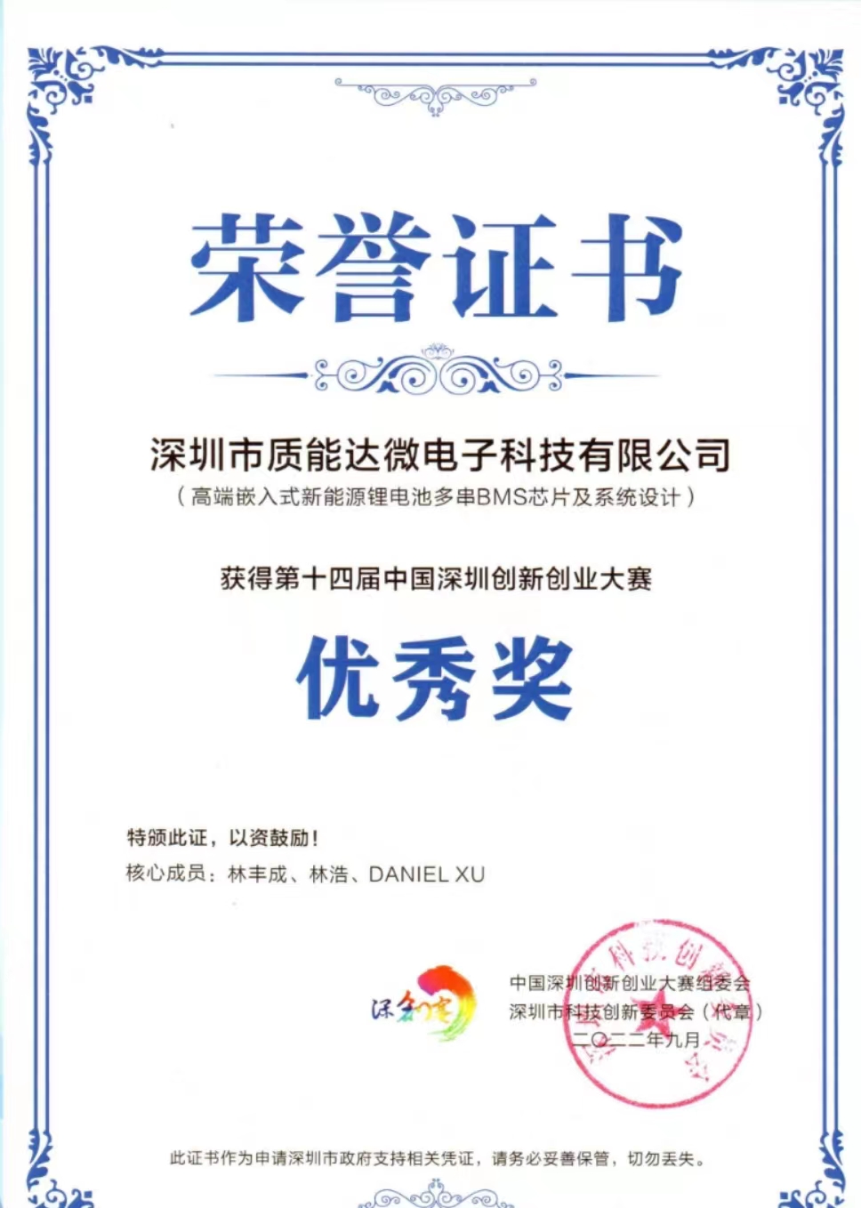 质能达BMS产品获得2022年第十四届中国深圳创新创业大赛优秀奖