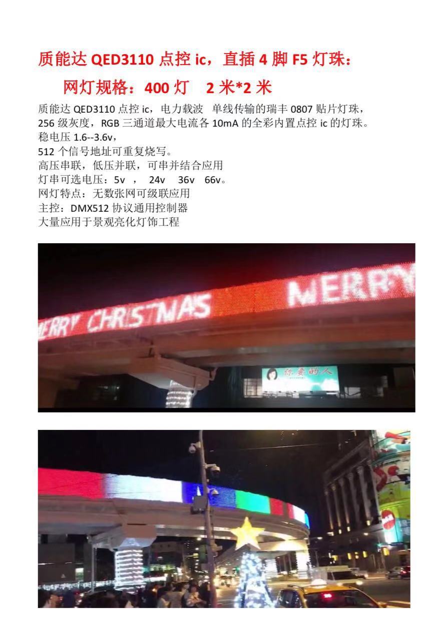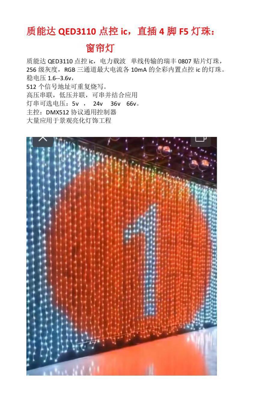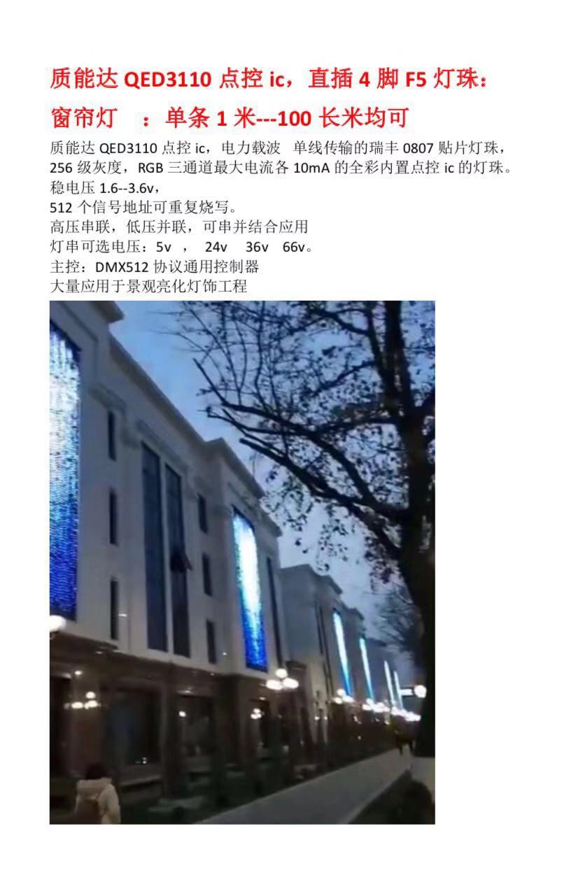 三: QED3110内置ic的各款灯珠,高压串联,低压并联,也可串并结合。直插灯珠产品电压5v,24,36v,66v目前有成熟控制器及电源,大量用于树灯,窗帘灯,网灯,及圣诞系列终端灯饰产品。