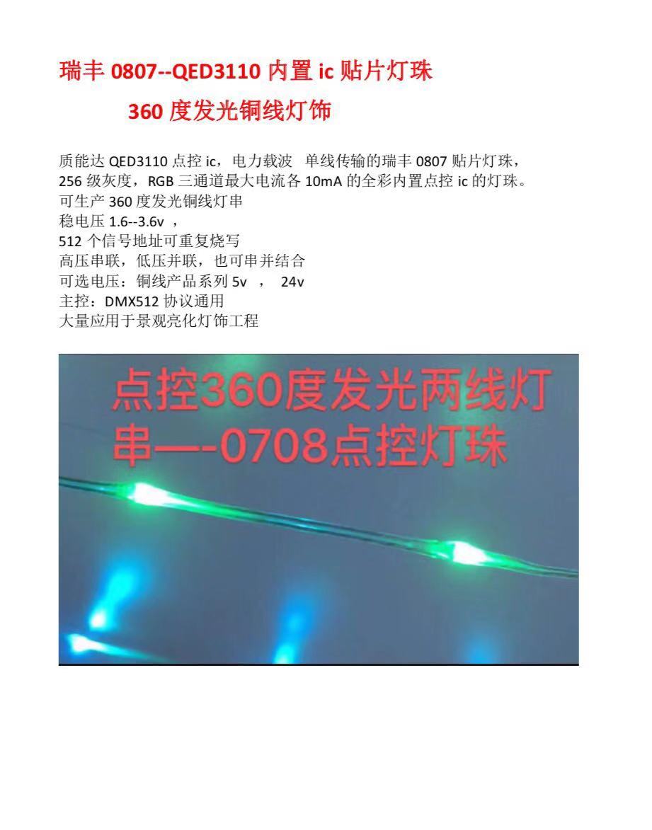 三: QED3110内置ic的各款灯珠,高压串联,低压并联,也可串并结合。直插灯珠产品电压5v,24,36v,66v目前有成熟控制器及电源,大量用于树灯,窗帘灯,网灯,及圣诞系列终端灯饰产品。