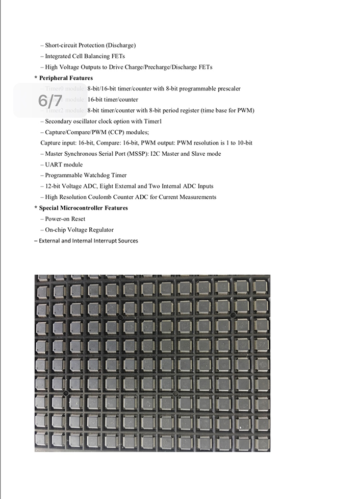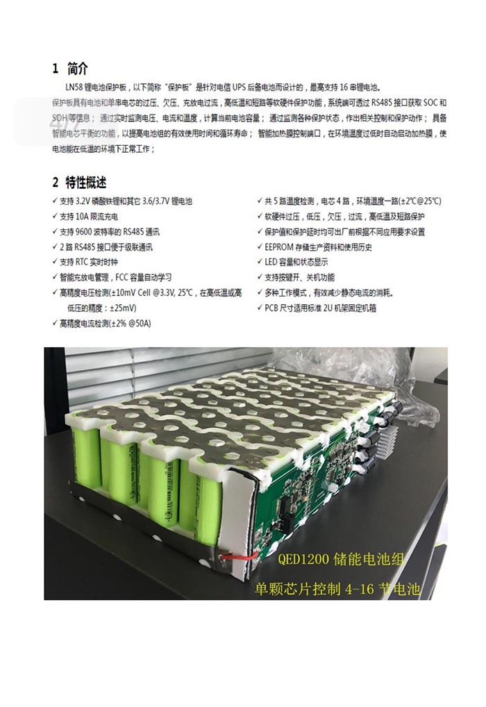 电池的充放电过程进行全自动过压、过流及过热保护,极少的外围元器件,同时可以进行级联宽展,实现软件一级保护,硬件二级保护,熔丝三级保护;芯片同时内置并可外接电荷平衡功能。