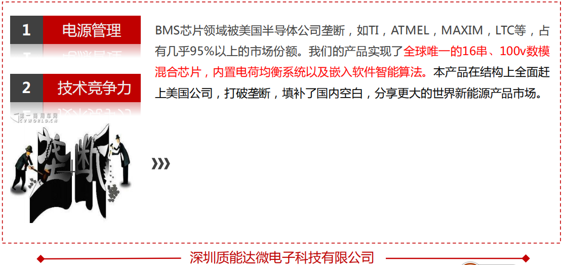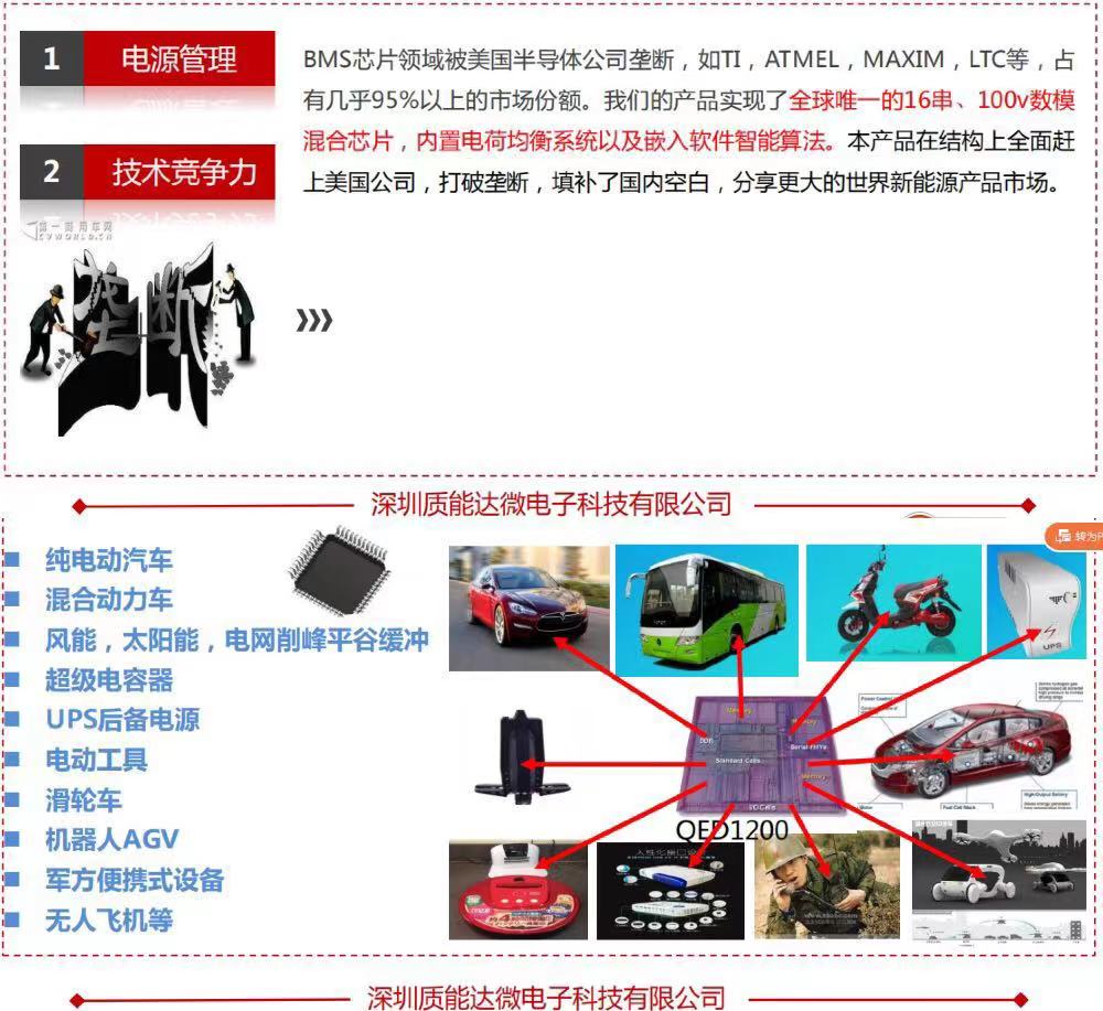BMS芯片领域被美国半导体公司垄断,如TI,NXP,MAXIM,LTC等,占有几乎95%以上的市场份额。我们的产品实现了全球唯一的20串、100v数模混合芯片,内置电荷均衡系统以及嵌入软件智能算法。本产品在结构上全面赶上并超过美国公司,打破垄断,填补了国内空白,将分享更大的世界新能源产品市场。